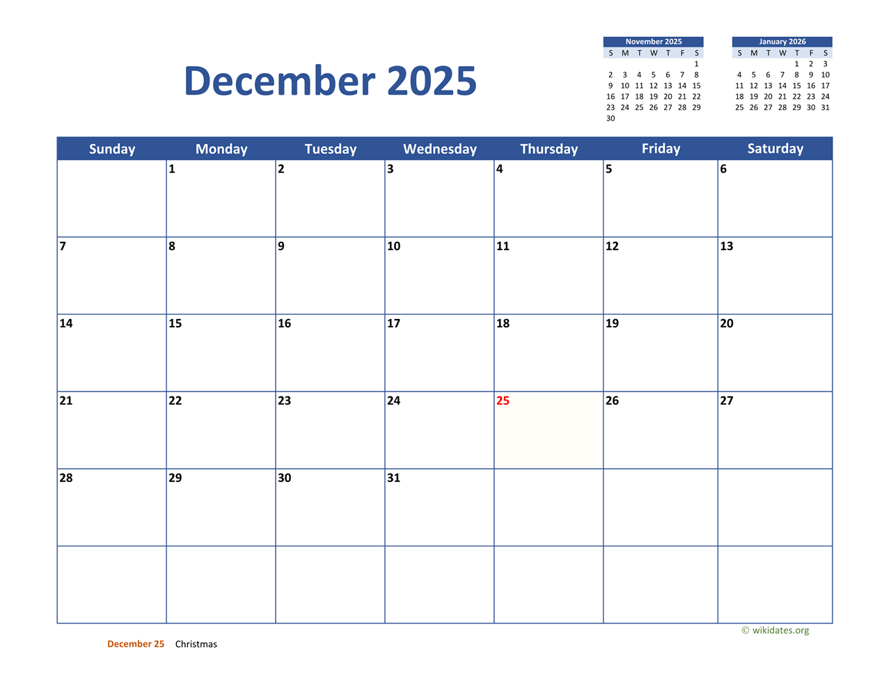 December 2025 Calendar Classic WikiDates