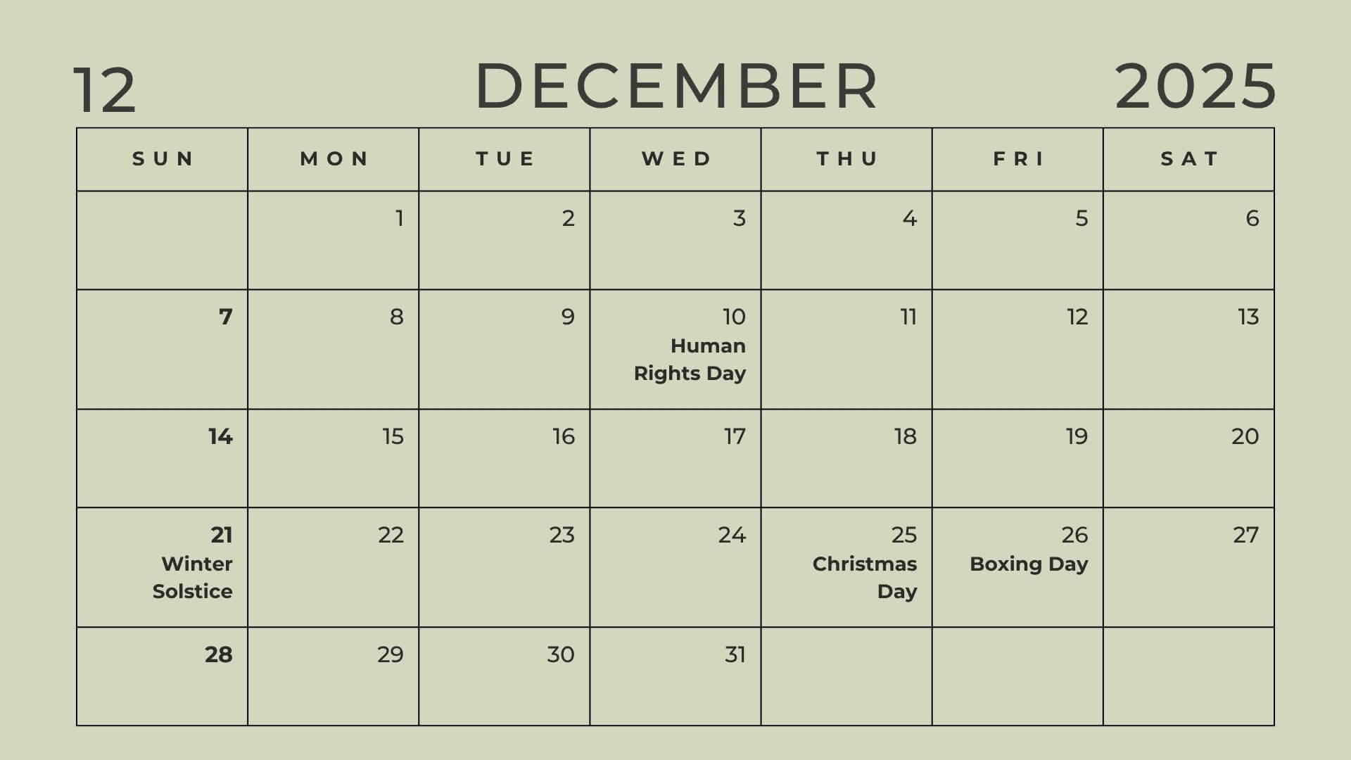 Calendar December 2025 With Holidays