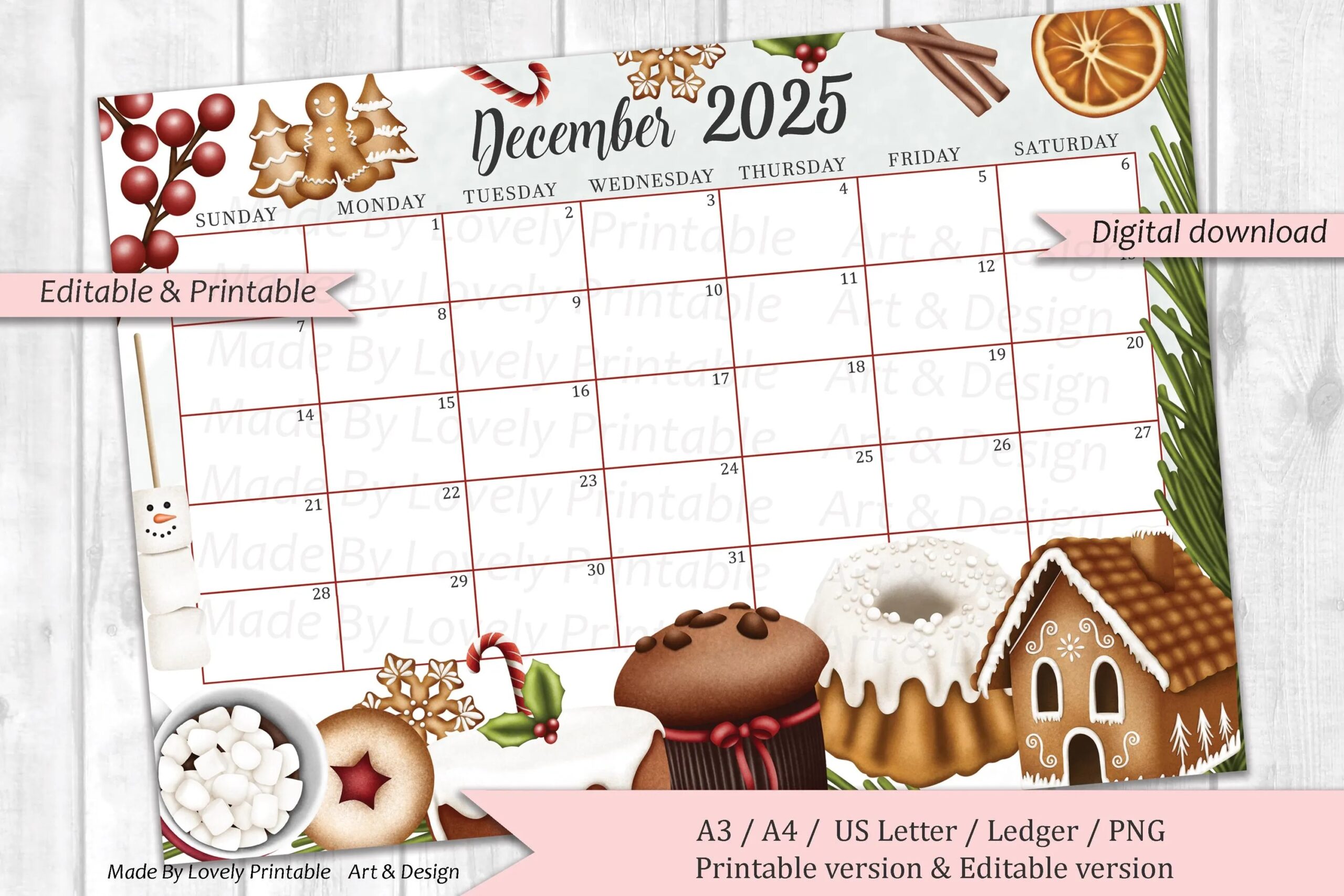 EDITABLE December 2025 Calendar Christmas Sweets Drinks Printable Monthly Calendar Planner Kids School Schedule Instant Download Etsy
