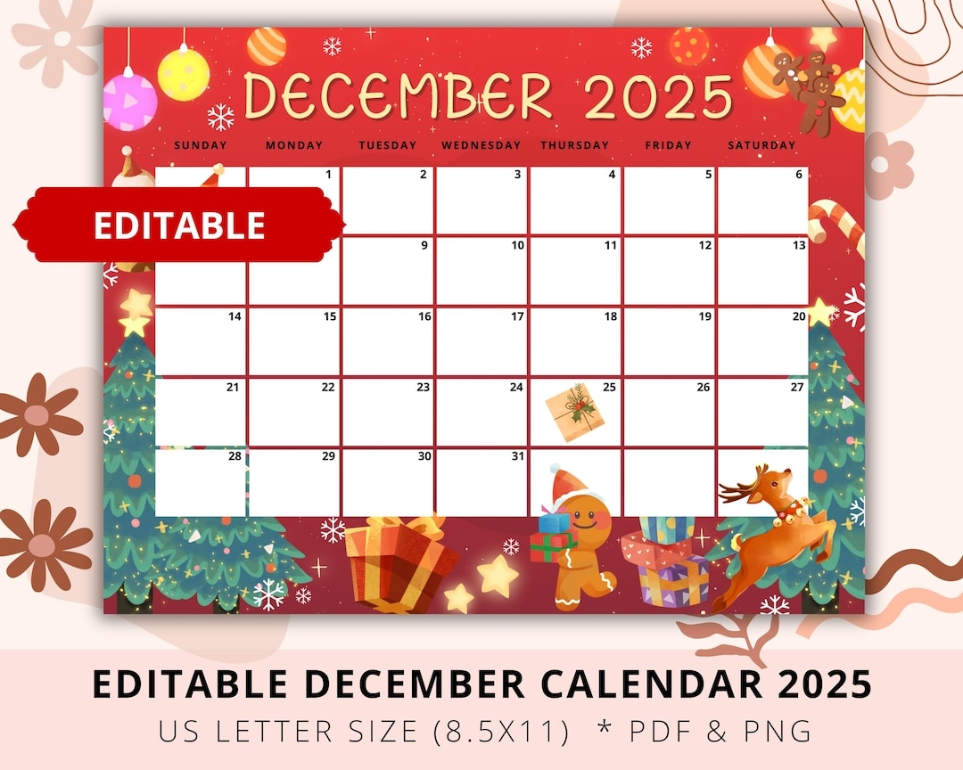 EDITABLE December 2025 Calendar Cheerful Christmas With Mail Gnomes Printable Monthly Calendar For Kids School Work Home Office Digital Etsy