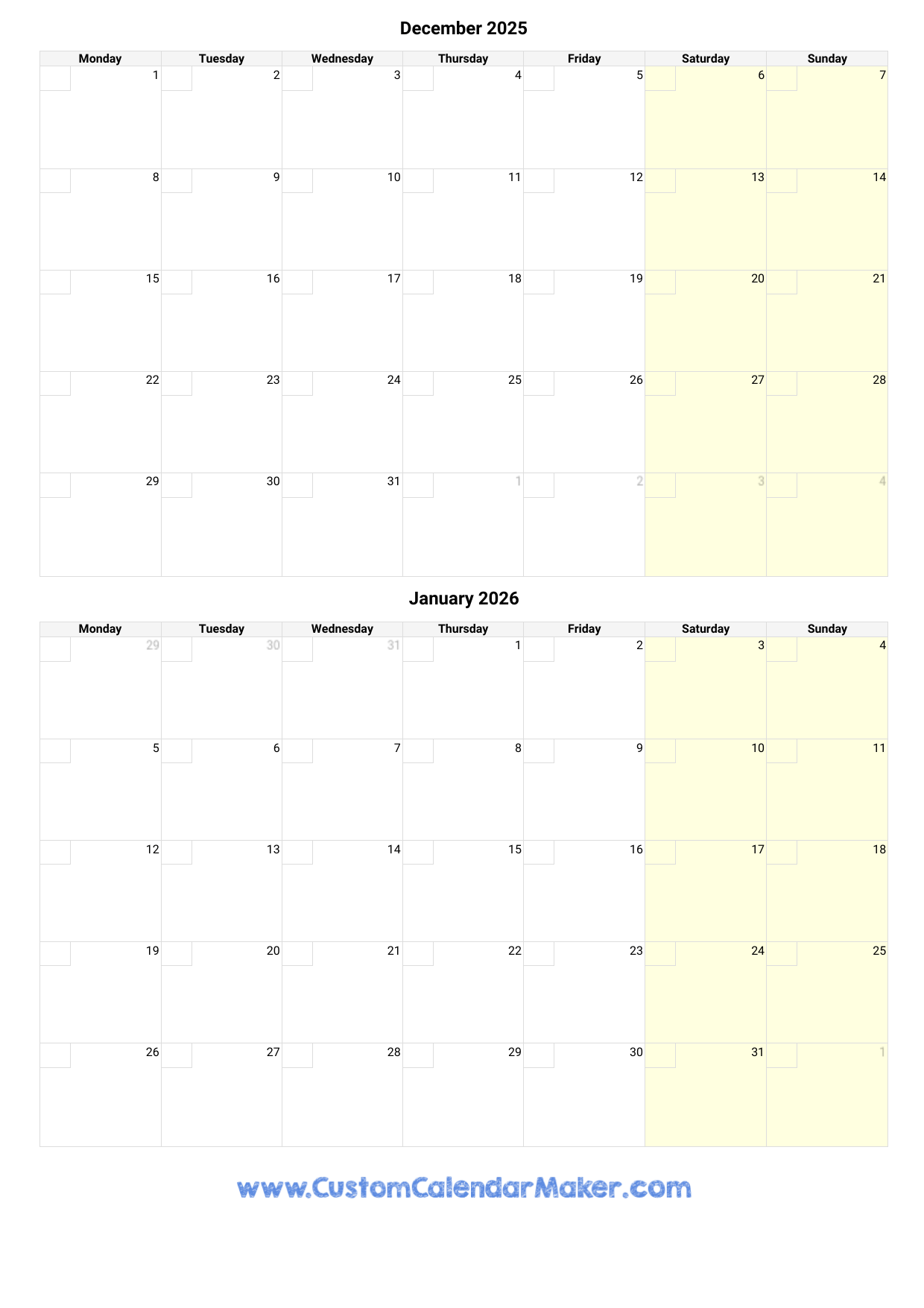 December 2025 And January 2026 Calendar Custom Calendar Maker