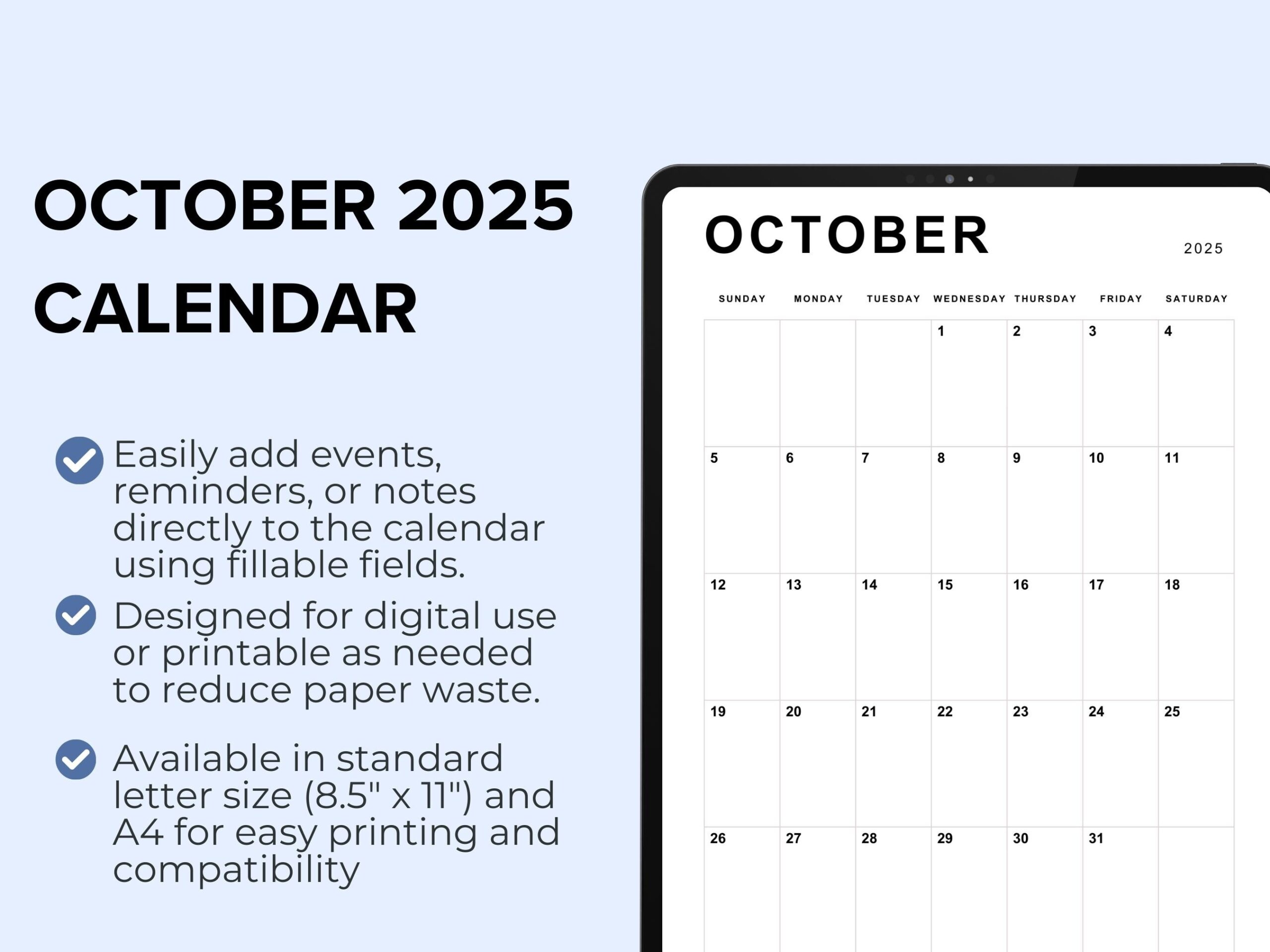 Editable October 2025 Calendar Minimalist Printable US Letter A4 Fillable Instant Download Etsy Israel